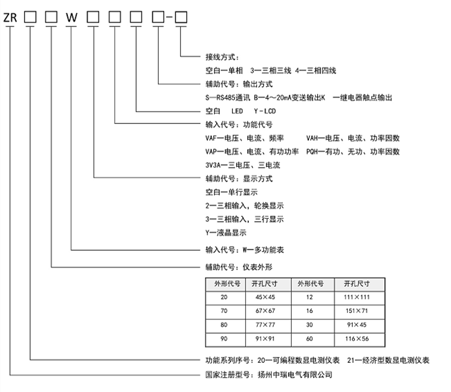 | 柜子类型 | 规格型号 | 仪表尺寸(mm) | 测量功能 | 备注 | 进 线 柜 | ZR3092W (液晶显示) | 96×96 | 电力网络中全部电量参数: 三相电流、三相电压, 有功功率、无功功率, 功率因数、频率,电度 谐波检测等 | 模拟量4-20mA输出(可选) 开关量输出(可选) RS485接口(可选) Y:普通液晶表 W+:谐波液晶表 | | ZR2090W | | ZR2090WY | | ZR2080W | 80×80 | | ZR2080WY | | ZR2012WY | 120×120 | | ZR3092W+ | 96×96 | 出 线 固 定 柜 (GGD,CCK等) | ZR2090A(V) | 面框 96×96 开孔 91×91 | 单相电流(电压) | 可选项: Y:液晶显示 S:RS-485通讯 K:上下限报警输出 B:4-20mA输出 | | ZR2090A3(V3) | 三相电流(电压) | | ZR2090A3(V3)Y | 液晶显示三相电流(电压) | | ZR2090A(V)K | 单相电流(电压)、上下限报警输出 | | ZR2090A3(V3)K | 三相电流(电压)、上下限报警输出 | | ZR2090A(V)B | 单相电流(电压)、4-20mA变送输出 | | ZR2090A3(V3)B | 三相电流(电压)、4-20mA变送输出 | | ZR2090Z-AV3 | 三相电流、三相电压组合 | | ZR2080A(V) | 面框 80×80 开孔 77×77 | 单相电流(电压) | | ZR2080A3(V3) | 三相电流(电压) | | ZR2070A(V) | 面框 72×72 开孔 67×67 | 单相电流(电压) | | ZR2070A3(V3) | 三相电流(电压) | | ZR2012A(V) | 面框 120×120 开孔 111×111 | 单相电流(电压) | | ZR2012A3(V3) | 三相电流(电压) | | ZR2012Z-AV3 | 三相电流、三相电压组合 | 出线抽屉柜 (GCK) (MNS)等 | ZR2020A(V) | 面框 48×48 开孔 45×45 | 单相电流(电压) | | ZR2020A2 | 三相电流 | | ZR2070A(V) | 面框 72×72 开孔 67×67 | 单相电流(电压) | | ZR2070A3(V3) | 三相电流(电压) | | 出线计量柜 | ZR5090-0 | 96×96 | 单相有功电度 | RS-485通讯 | | ZR5090-1 | 三相三线有功电度 | | ZR5090-2 | 三相三线无功电度 | | ZR5090-3 | 三相四线有功电度 | | ZR5090-4 | 三相四线无功电度 | 无功 补偿柜 | ZR3092W | 96×96 | 全部电量参数和电能 | RS-485通讯,4路开关量输入 | | ZR2012W | 120×120 |