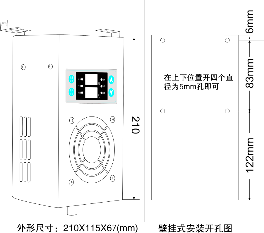 1、使用M5螺钉或者5mm的铆钉固定。安装时抽湿装置必须竖放,出水口朝下;