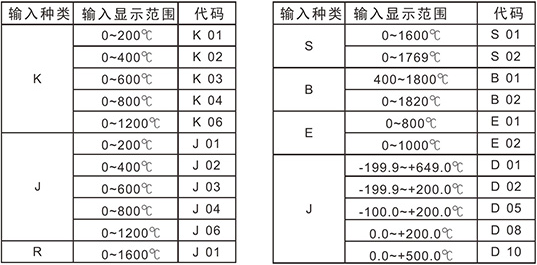 ③、输入种类: 热电偶K、J、R、S、B、E、T、N、W5Re/W26Re、PLII、U、L, 热电阻Pt100、JPt100